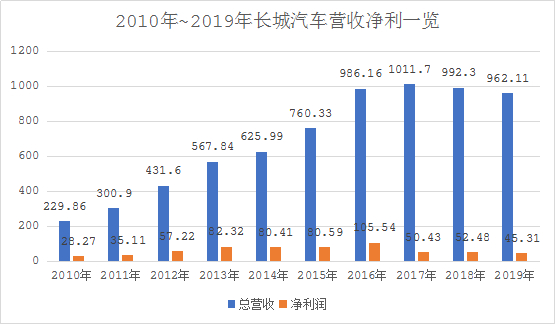 2020年3月31日,长城汽车股份有限公司(以下简称长城汽车,601633.SH)公布了《截至2019年12月31日止年度未经审计业绩公告》,(以下简称“业绩公告”)数据显示,2019年长城汽车总营收962.11亿元,同比减少3.04%,净利润45.31亿元,同比下滑13.66%。2016年,长城汽车的净利润达105.54亿元,创下了历史新高,但2017年“腰斩”至50.43亿元,然而,净利润下滑的颓势在2019年加剧,45.31亿元的净利润数据为近8年来最近。
