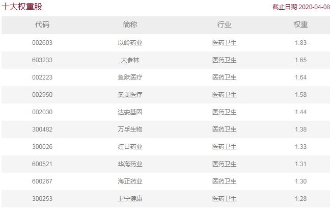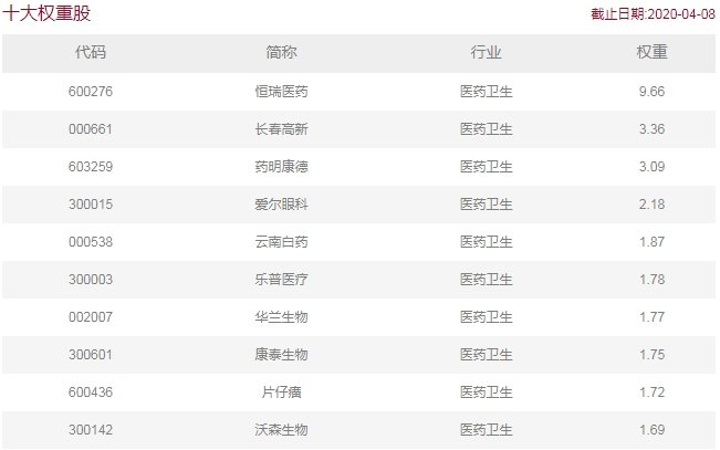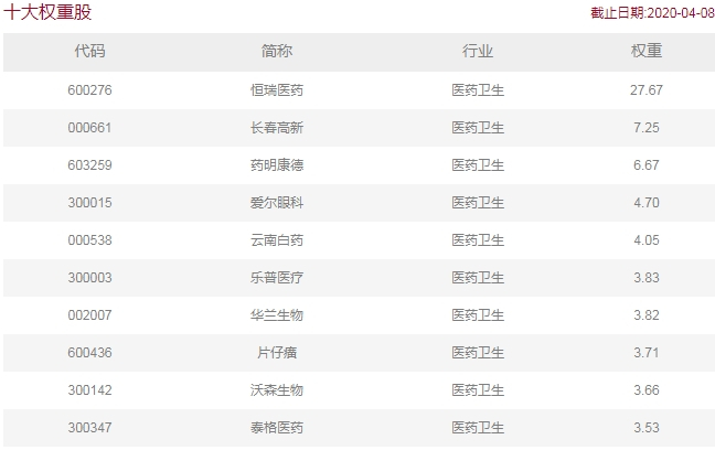 和中证医药指数一样,该指数的前十大权重股中,大市值公司(如恒瑞医药)权重较高。