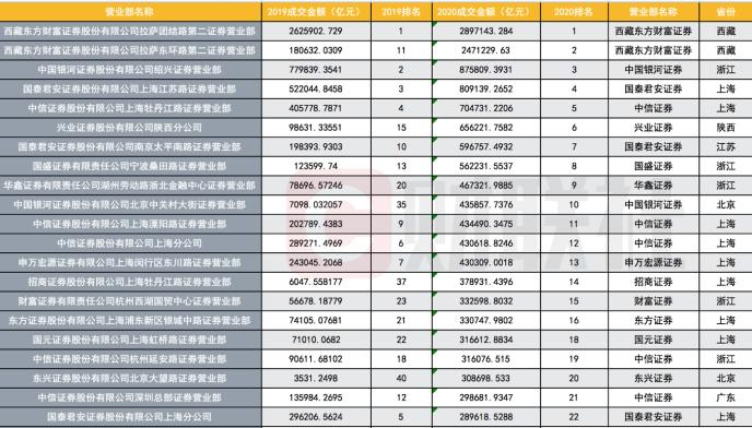 第二位是兴业证券陕西分公司,2019年一季度成交金额位9.86亿元,排名第79位,2020年一季度成交金额为65.62亿元排名第11位,座次上升了68位。