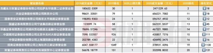 第三位是国泰君安南京太平南路证券营业部,2019年一季度成交金额位19.84亿元,排名第24位,2020年一季度成交金额为59.68亿元排名第12位,座次上升了12位。