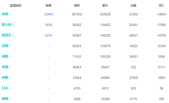 美国目前确诊病例累计达425828例,死亡病例为14604例;意大利目前死亡病例最多,其死亡病例达17669例,确诊病例为139422例;西班牙确诊病例达148220例,死亡病例为14792例。法国和德国累计确诊也超过10万例。
