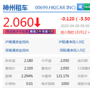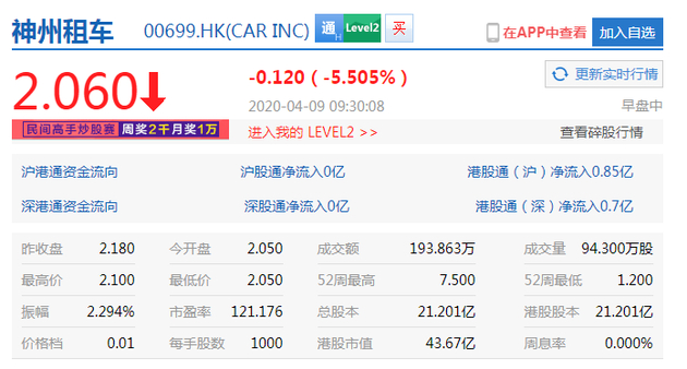 4月9日早间消息,神州租车港股开盘下跌逾5%,截至发稿,神州租车报2.06港元跌5.505%,港股市值43.67亿港元。今日早间,神州租车今日发布公告称,本公司董事会于2020年4月8日得知本公司主要股东神州优车股份有限公司(以下称“神州优车”)作出的权益披露存档,优车科技有限公司(神州优车的全资附属公司)持有本公司的44,666,000股股份(占本公司于本公告日期已发行股本总额约2.11%)已于2020年4月3日应若干神州优车贷款人要求根据相关融资协议条款于市场上出售。