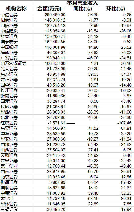 27家券商营收同比出现下滑,其中10家下滑逾4成,财通证券当月实现营收0.58亿元,同比减少了83.34%,是除了收入为负的红塔证券外,唯一一家单月营收不足1亿元的券商,同时也是营收下降幅度最大的券商。