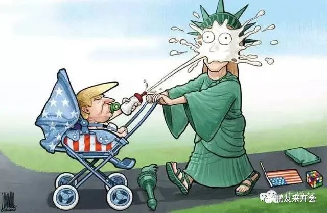 讽刺特朗普的漫画很多,上边这幅意在嘲笑特朗普用“婴儿姿态”,迫使“美国意识形态”臣服于他,公众还无可奈何。这个描述是正确的,但背后的深刻逻辑比漫画要复杂得多。特朗普的“婴儿姿态”不是幼稚,而是用婴儿都可以理解的方式重击原有秩序,获取民众好感。可以说,特朗普这种方式成功了。
