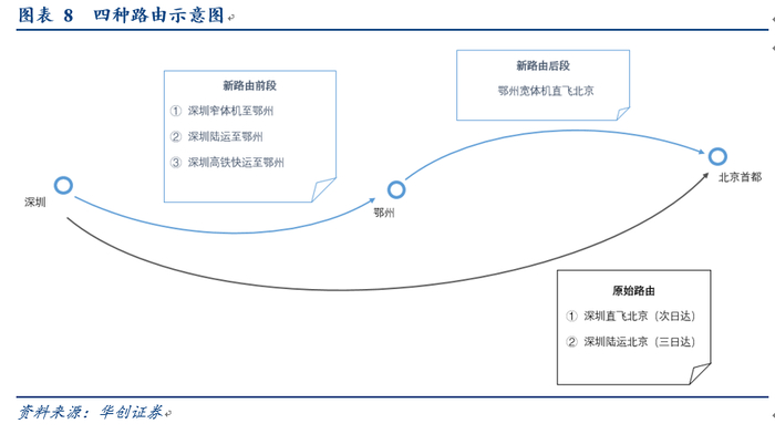4)高铁运输(深圳-鄂州)+宽体机(鄂州+北京):吨公里成本1.08元,综合耗时12.7小时。