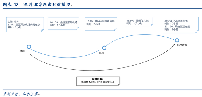 即便次日配送,相较于当前深圳-北京次日18点前送达亦是明显提升时效。(理论模拟,实际操作有多重限制需论证)。