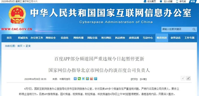 4月7日,北京市网信办,针对百度APP多个频道存在严重违规问题,约谈百度公司负责人,百度APP推荐频道、图片频道、视频频道、财经频道、科技频道自4月8日上午9时起暂停更新,清理违规内容,开展深入整改。