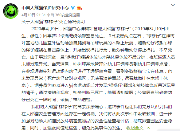 中国大熊猫保护研究中心官方微博10日发布通报称,4月9日,熊猫中心神树坪基地大熊猫“禄禄仔”(2019年8月10日出生,雌性)因丰容吊球绳缠绕颈部窒息死亡。