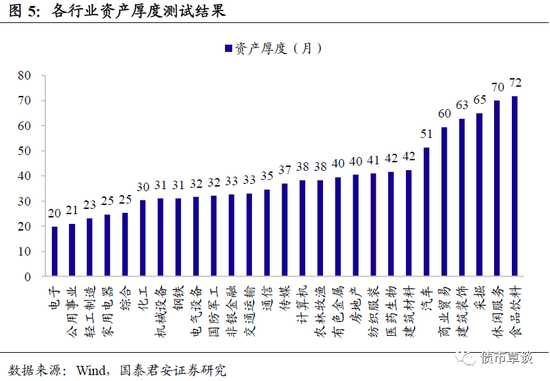 财务层面,对各行业外需清零情况下支撑时长进行资产厚度测试。我们假定此次疫情使各行业海外需求清零,进行压力测试,使用(货币资金+国内收入)/刚性支出×12计算各行业的资产厚度,衡量不同行业现金流能够覆盖其刚性支出的月份数。其中,刚性支出等于人工成本、租金成本、利息支出之和,采用企业员工总数×行业平均工资计算人工成本,采用租赁费与仓储运输费之和衡量租金成本,以短期有息负债与利息支出之和衡量财务支出。