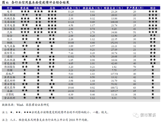 从经营、财务两维度分析行业受外需冲击影响程度。经营层面,考虑全球疫情的影响,定性分析疫情对各行业供需格局的影响;财务层面,假设国外部分业务需求清零,仅考虑账面现金资产和国内部分业务收入,对各行业能够覆盖刚性支出的时长进行资产厚度测试,刚性支出考虑人工成本、财务支出和租金成本。