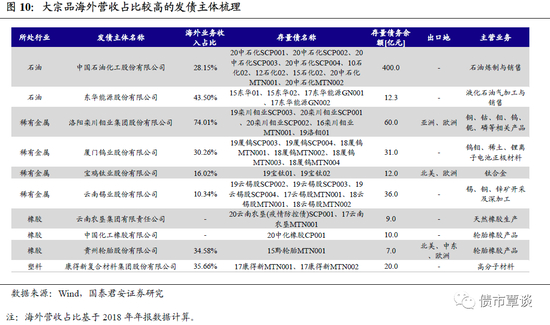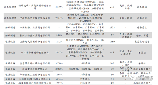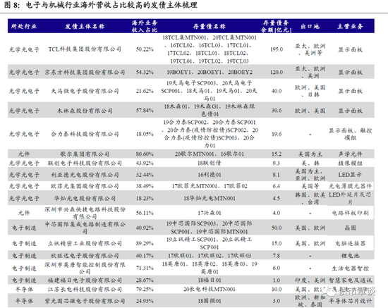 我们进一步统计了申万二级子行业的海外业务收入占比情况,如果以海外业收入占比是否达到15%统计是否为外需型行业,那么符合标准的子行业达到44个。这其中刨去一些发债金额较少的行业,大致可以分为如下四类:(1)电子与机械工业,包括面板、消费电子、半导体、LED、汽车零部件、船舶制造、电源设备、通信设备与工程机械等子行业;(2)服务行业,包括贸易、航空、航运和多元金融;(3)大宗品,包括石油、稀有金属、橡胶与塑料;(4)轻工业,包括纺织、家电、化学制药与家用轻工。