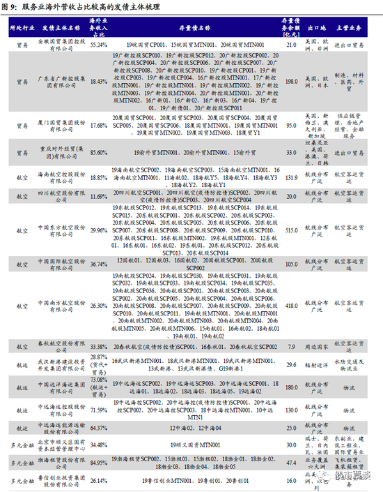 我们发现存量债余额较大且海外收入占比较大的服务业子行业中,贸易、航空、航运和多元金融是最为主要的几个子行业。贸易业整体营业规模萎缩、应收账款回收节奏被打乱,同时存在明显的存货跌价风险;航空业务量,尤其是国际航线大幅萎缩,需关注部分再融资能力相对薄弱企业能否安全渡过偿债密集期;多港口因疫情停摆,港口管制可能使航运面临停航危机;多元金融行业部分企业以海外租赁为主,受海外疫情扩散影响较大。