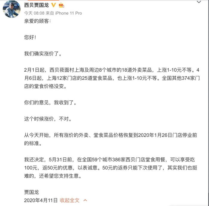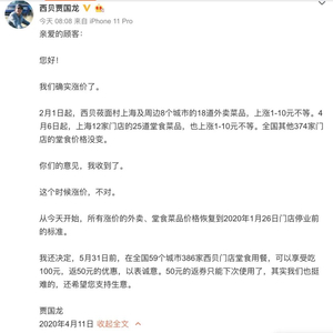 “我们确实涨价了……你们的意见,我收到了。”4月11日上午,西贝餐饮董事长贾国龙在其微博上发布了一则简短的致歉信。贾国龙坦言这个时候涨价不对,并表示从今日开始,所有涨价的外卖、堂食菜品价格恢复到2020年1月26日门店停业前的标准。