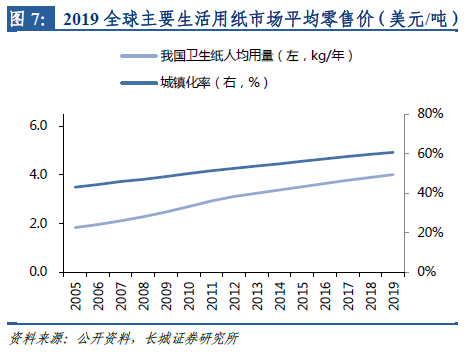 卫生纸作为最基础的生活用纸品类,使用量将随着城镇化进展进一步增加。截至2019年,我国卫生纸人均年用量约为4千克,美国、德国、日本分别为8.3、6.7、6.0千克。发达国家卫生纸人均用量已达到稳态,在过去十年中没有明显增长。其中,日本由于智能马桶普及率较高,因此人均卫生纸用量在发达国家中处于偏低的水平。我国全国人均卫生纸用量明显低于发达国家,但一线城市基本可以达到发达国家的水平。因此我们认为,决定卫生纸用量的关键因素仍是经济水平,使用习惯和环保意识等因素影响较为有限。从2005-2019年我国人均卫生纸用量逐年递增,且变化趋势与城镇化水平高度相关。