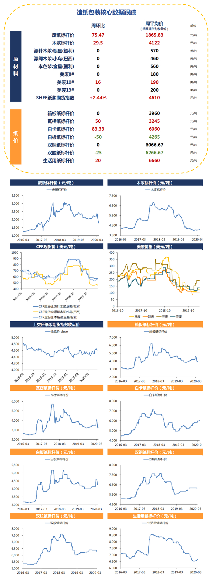 废纸系价格略有回升,文化纸表现平稳静待招标季与开学季。废纸系:原材料废纸自3月28日止跌反弹,国废本周均价为1879元/吨,周环比上涨4.6%。废纸价格上升推动原纸价格窄幅上涨,箱板纸/瓦楞纸周环比分别持平/+1.25%于3960元/3232元。短期来看,下游需求略有恢复但仍然偏弱,废纸系或仍以震荡为主。文化纸:本周木浆价格略涨0.65%至4116元,Suzano、芬林芬均表示将在保障人员安全的基础上继续稳定供应纸浆,海外疫情暂未对木浆供应构成实质性影响。双胶纸周环比-0.77%于6273元/吨,双铜纸周环比-0.87%至6066元/吨。铜版纸下游需求恢复较慢,但供给端集中度高,几大纸厂已有减产计划,预计后续将维持弱平衡的格局。双胶纸需求恢复尚不明显,但各地开学日期临近,学生本册等用纸将为需求提供支撑,预计双胶纸盈利可在高位维持。