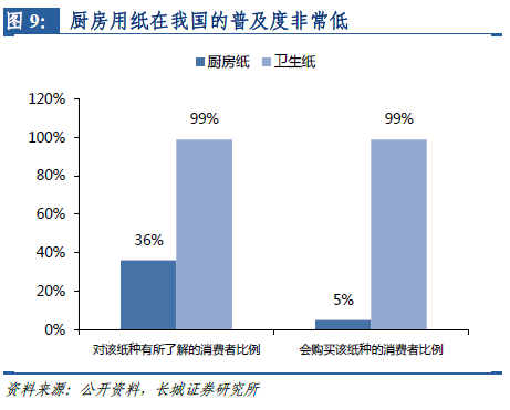 厨房纸尚处于导入期,随着消费者教育的深化普及率有望快速提高。2019年我国厨房纸零售额仅有10亿元左右,人均用量仅为0.04千克(不足半卷),而欧美国家的人均用量基本都在1kg以上。欧美使用厨房用纸已经有较长的历史,普及度也明显高于我国。根据Statista的调查结果,95%以上的美国消费者都会购买厨房用纸,而在我国只有5%的消费者会购买。而在品类中横向对比来看,我国99%的消费者对卫生纸有了解,而对厨房用纸了解的消费者仅有36%。随着消费能力提升和95后逐渐成为家庭日用品的消费主力,厨房用纸消费量有望进入快速增长期。若人均厨房用纸使用量达到1kg的水平,将为生活用纸带来超过200亿元的增量市场。