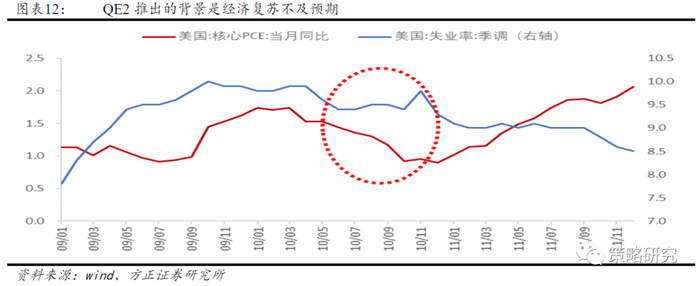 美国第二轮量化宽松背景是经济的重新下滑。自2010年3月美联储明确退出QE1以来,2010年5月以希腊为代表的欧债危机升级,拖累美国经济复苏不及预期。从各项经济数据来看,用来衡量通胀的核心PCE自2010年3月之后持续下滑,2010年四季度回落至1%以下,远不及政策目标1.5%-2%的水平,失业率在2010年一直居高不下,前三季度均在9.5%以上。从美联储议息会议的表述来看,相较于6月份对经济“逐步改善”的判断,8月10日美联储对经济的看法转向“放缓”,并推出资金转投国债计划(QE-lite)以避免美联储资产负债表缩水。