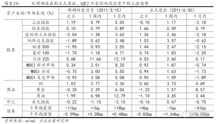 QE2从预期到落地对风险资产有提振作用,从明确退出到正式退出不会影响风险资产的上涨趋势。QE2对资产价格的影响可以分为两个阶段,第一阶段为预期将要实施QE2到正式落地,第二阶段为预期将要退出QE2到正式退出。第一阶段从政策预期到落地,QE2短期对股票、商品均有提振作用,美元指数走低,美债收益率下滑,但由于QE2市场早有预期,加上规模略不及预期,QE2正式落地后风险资产在脉冲式上涨之后会逐渐回落,表现为2010年11月QE2正式落地后一个月部分股票指数以及商品下跌,美元指数上涨,美债收益率抬升。第二阶段从政策明确退出(不再追加购买额度,按原计划终止QE2)到正式退出,由于此阶段经济企稳,需求回升,同时发达经济体仍保持极为宽松的流动性环境,股市以及大宗商品在此阶段仍是上涨的,美元指数由于美国经济复苏较为疲弱持续下跌,美债收益率在该阶段震荡下跌。对于中国国债收益率,其更多受国内经济周期以及流动性的影响,同QE2关联度不大。