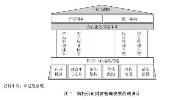 财富管理业务是以客户为中心,针对客户投融资需求,设计全面的财务规划。与资产业务不同,财富管理业务更加体系化和系统化,业务系统包含组织架构、客户服务、产品体系、网点渠道、内部管理、信息系统等方面的建设。信托公司财富管理业务发展首要问题是战略定位,战略定位决定着公司核心业务系统建设,包括产品与客户管理、风险与信息管理建设,也决定着财富中心运营体系,包括运营机制、组织架构、考核激励、流程制度方面的建设和实施。