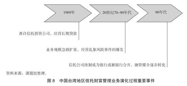 从20世纪70年代开始,中国台湾地区进入经济腾飞时期,此时期银行数量较少,且监管要求不得开展长期贷款业务。1969年开始出台相关规定,准许信托投资公司设立,为企业提供中长期资金。20世纪70年代末,信托投资公司吸收的信托资金占全部金融机构存款余额的7.75%,放款占全部金融机构的9.1%。由于业务规模的急剧扩张,风险管理手段未及时跟上,最终导致多起风险事件的爆发。