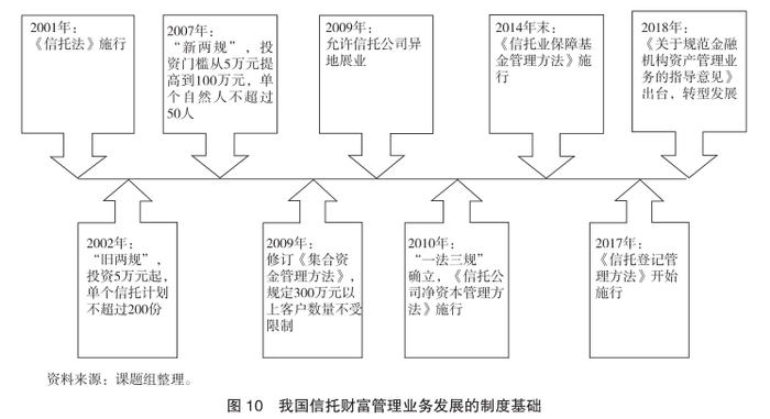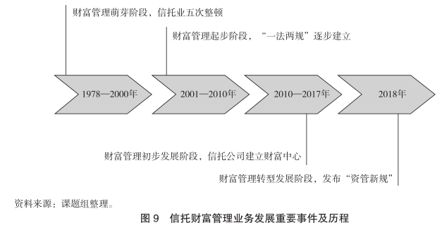 第四阶段:财富管理转型发展阶段。2018年4月27日,《关于规范金融机构资产管理业务的指导意见》(以下简称“资管新规”)正式印发,财富管理业务发展成为信托公司回归本源的重要业务之一。2018年9月中国银保监会信托部的《关于加强规范资产管理业务过渡期内信托监管工作的通知》明确指出,公益(慈善)信托、家族信托不适用“资管新规”相关规定,一些信托公司开始从传统的房地产信托、基础设施信托等转型进入资产证券化业务、家族信托、慈善信托等领域,培育新的利润增长点。