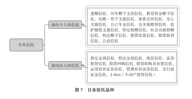 日本信托产品种类众多,以客户类型为标准,可细分为面向个人的信托产品与面向法人的信托产品,见图7。