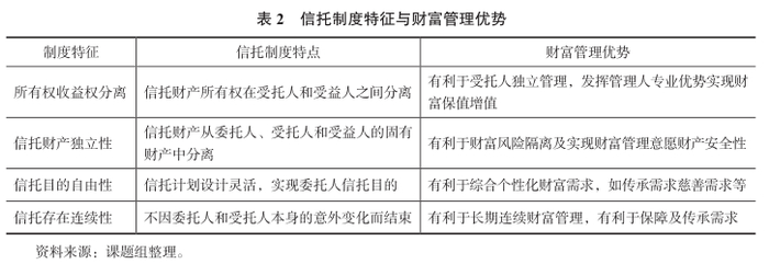 财富管理的需求是多层次和综合性,主要体现为财产保障需求、财富积累需求,财富传承需求和慈善需求,信托作为一种法律契约,其“代人理财”的信托制度是财富管理的天然承载者。信托财产具有权益分离、独立性、有限责任、连续性等特点,独有的制度优势应用于财富管理保证了实现财富需求过程中的灵活性、稳定性以及安全性。