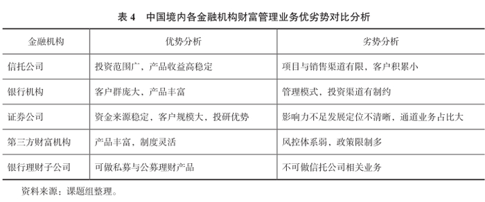 在此阶段,信托公司、银行、证券包括第三方财富机构和基金子公司都在财富管理行业展开激烈竞争,信托公司在投资范围方面具有竞争力,但在项目和销售渠道方面较为有限。各类金融机构财富管理业务发展优劣势对比,见表4。