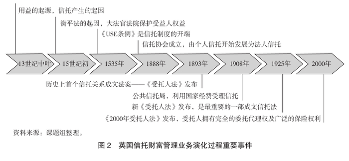 1535年英国《USE条例》是信托制度的开端,“衡平法”又为英国的USE制度的发展奠定了法律基础。英国还颁布了《受托人条例》,开始构建信托法律体系,信托立法日趋完善。在漫长的历史演进中,英国的信托财产由最初的不动产逐渐扩展到动产、资金、股权等各个类型。受托人从最初的自然人逐渐向自然人和法人均可成为受托人转变,受托人职责也从消极型向积极型演化,信托法判例也逐渐向成文法的方向发展。其历史演化过程及重要事件见图2。