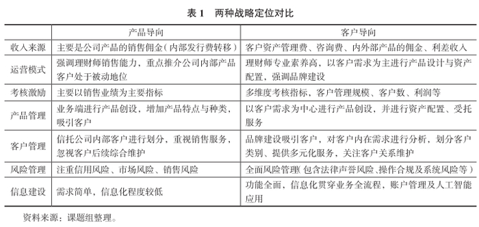 回归信托本源的战略定位是信托公司财富管理业务发展的必然之路,从产品销售导向逐步回归信托本源,即走向以客户需求为核心的资产管理、资产配置和受托服务。两种战略的主要区别见表1。
