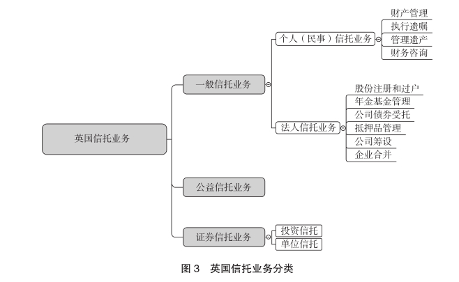个人信托业务作为英国信托业最显著的特点,主要涉及财务咨询、财产管理、执行遗嘱、管理遗产等领域。信托文化也体现英国传统的荣誉感和良心观念塑造的荣誉底色。目前英国的信托业务主要分为三类:一般信托(个人信托和法人信托)、公益信托、证券信托。法人信托即由法人作为受托人的信托。法人信托主要包括股份注册和过户、年金基金管理、公司债券受托、抵押品管理、公司筹设、企业合并等。法人信托主要是银行和保险公司的兼营业务,高度集中在大银行所设立的信托部。
