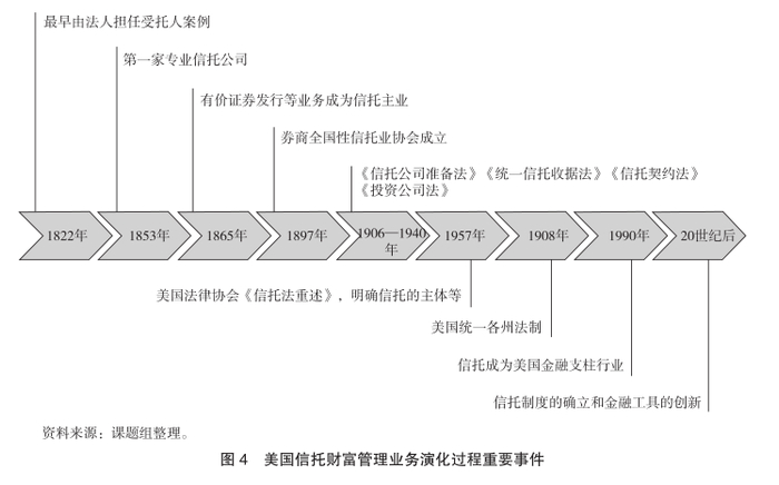 美国与英国信托的发展有很大区别,英国以民事信托为主,而美国则以商事信托为主,美国信托资产中90%以上都属于商事信托。信托在美国最初以民事信托为主,后逐渐从个人信托向法人信托转变。英国的受托人主要以个人为主,而美国则以法人为主,其根源在于两国文化基因的差异。英国的绅士文化倡导社会荣誉,而美国的商人文化则决定了创新发展出以营利为目的的商事信托,并进一步地将商事信托,从契约型发展为更为稳定的公司型。在美国信托业务最初是由保险公司运营管理,后逐步变为由银行为主,其历史演化过程及重要事件见图4。
