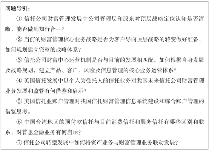 我国信托公司财富管理业务起步较晚,财富管理业务的发展需要在人员、时间和资金上进行持续投入,这一特点与传统的信托业务盈利模式不同。信托公司的管理层和股东都需要加强对财富管理业务特点的理解。