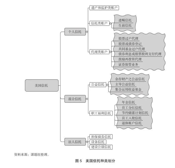 美国信托业务主要包括个人信托、法人信托、混合信托。此外,美国还创新了许多信托投资工具,如共同信托基金(MTF)、货币市场互助基金(MMMF)、商业汇票(CP)、大额存单(CD)、国库券(TB)、现金管理账户(CMA)、短期资金市场以及融资租赁业务等。