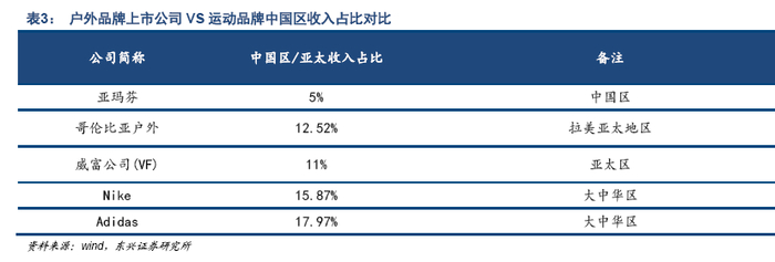 2018年中国的高净值人群数量接近200万人;与2014年相比近乎翻倍,年均复合增长率达到23%。富裕人群的增加,他们更推崇“户外+生活”等相关理念,对户外用品的专业要求也更高。以始祖鸟母公司亚玛芬为例,亚玛芬集团中国区收入占比仅为5%,而全球运动品牌龙头Nike和Adidas中国区收入占比均超过15%。高端户外运动品牌对比高端运动品牌看,在中国的发展潜力巨大。