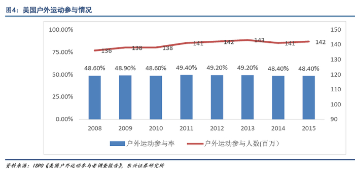 发达国家户外运动参与率高,推动户外品牌蓬勃发展。发达国家户外运动发展历史悠久,文化底蕴深厚,有群众性户外运动基础。2015年美国参与户外运动的人数为1.4亿人,约占美国人口总数的48.4%。50%的民众参与率使得户外休闲产业成为第三大消费支出产业,仅次于金融服务保险业和医疗门诊业,并且创造了最多的就业岗位。