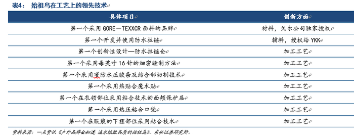 始祖鸟极其重视新材料的运用,因此也十分重视与上游原材料企业的联合开发。始祖鸟的产品价格在行业内属于顶尖,不仅仅是其成本昂贵、做工精细,更是其创新赋予的附加值高。除了自身的研发,在与工厂合作过程中,始祖鸟会帮助工厂进行系统、关键技术和生产基础知识的培训,并逐步帮其引入专业的生产和管理方法,积极推动合作供应商的优化成长。