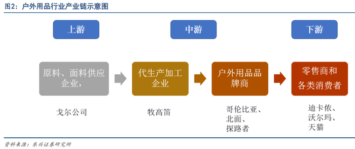 户外用品的产业链有四个环节,分别是原料生产环节、工厂加工环节、品牌商环节、下游零售环节。1、户外用品的原料主要是化纤材料,偏标准品,行业产能充足;面料企业如果掌握专有技术,则对品牌商形成较强的议价权,例如戈尔公司的Gore-Tex面料目前仍是性能最卓越的户外面料。2、代工企业是附加值最低的环节,我国境内有众多户外用品的OEM/ODM 业务代工企业。3、品牌商在产业链内价值最高,海外品牌哥伦比亚(Columbia)、北面(The North Face)等都定位中高端,国内品牌探路者等主打性价比。4、下游企业分为两种,一是专门的户外用品零售商如迪卡侬(Decathlon)、三夫户外,另外是综合性零售商如家乐福、沃尔玛等。