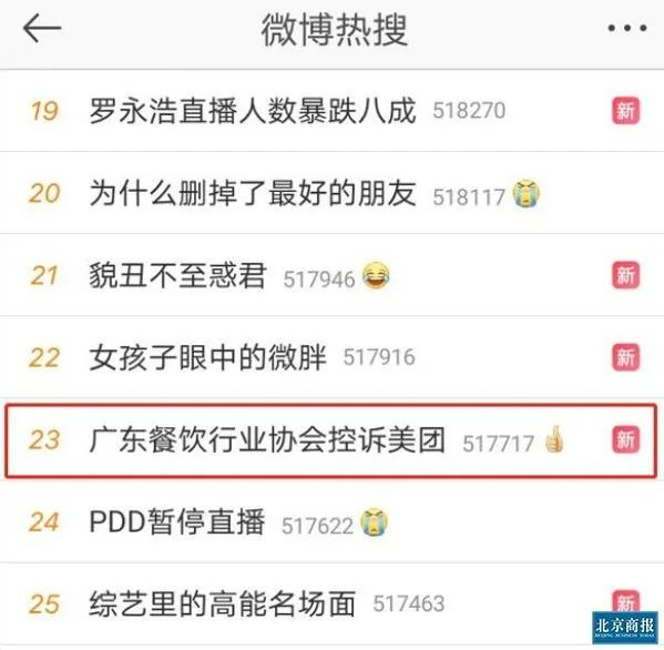 “广东餐饮行业协会控诉美团”的话题在近期登上微博热搜,由此可见,此次降佣“反击”并不是个人战。