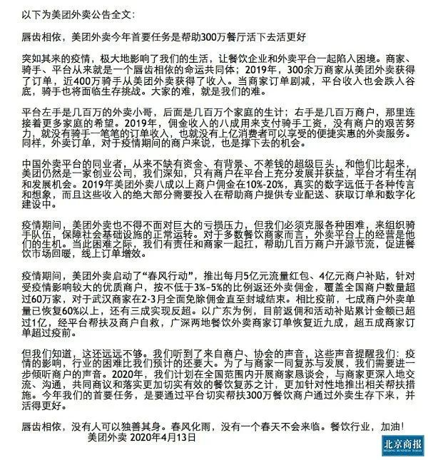 根据美团发布的公告显示,在疫情期间,美团外卖启动了“春风行动”,推出每月5亿元流量红包、4亿元商户补贴,针对受疫情影响较大的商户,按不低于3%-5%的比例返还外卖佣金,覆盖全国商户数量超过60万家,对于武汉商家在2-3月全面免除佣金直至封城结束。相比疫前,七成商户外卖单量已恢复60%以上,有三成实现反超。此外,2020年计划在全国范围内开展商家恳谈会,将更加针对性地推出相关帮扶措施。
