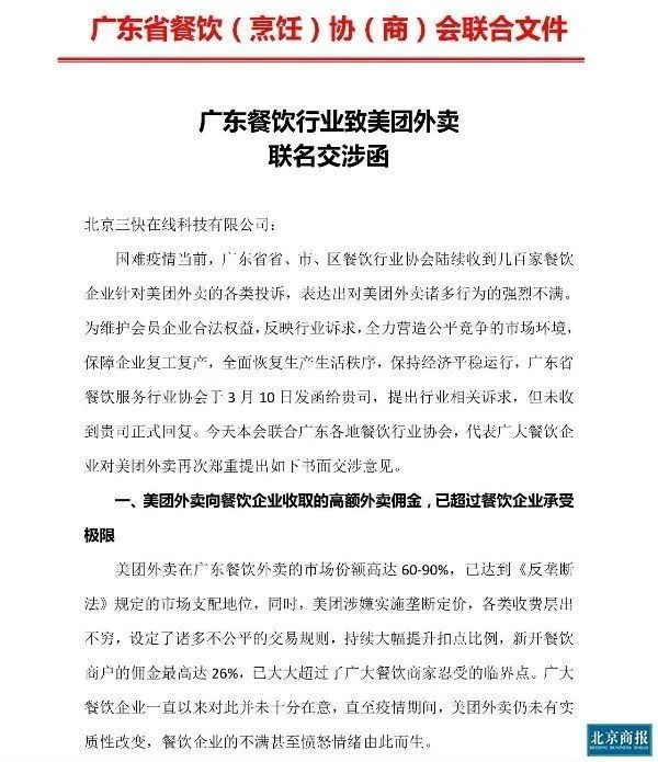 几天前,广东省餐饮服务行业协会联合省内各地餐饮行业协会,向美团外卖递交了联名交涉函,呼吁美团直接减免整个疫情期间广东省内所有餐饮商户外卖服务佣金5%或以上,取消独家合作限制等其他垄断条款等。