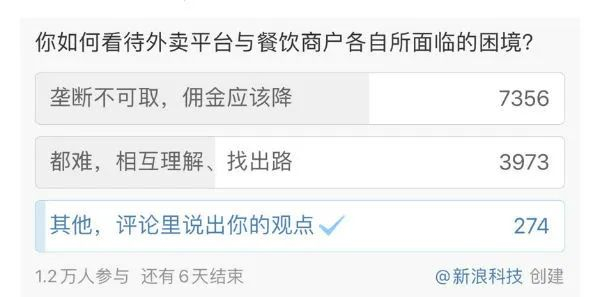 根据新浪科技发起的“你如何看待外卖平台与餐饮商户各自所面临的困境?”投票来看,1.2万人参与中,61.3%的人认为“垄断不可取,佣金应该降”,33.1%的人认为“都难,相互理解、找出路”,另外25.6%的人选择“其他”。
