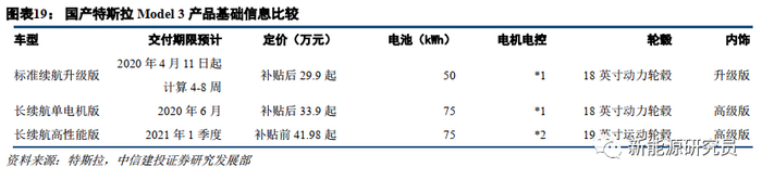 但我们也认为,一方面特斯拉在电气系统方面的技术优势使得其电池应用技术路线切换难度不大,一方面底盘设计等仍需要一定时间,所以宁德时代从常规磷酸铁锂电池单体-模组-电池包产品快速切入特斯拉Model 3产品较现实;各类CTP电池有望用于后续的Model 3、Model Y车型。
