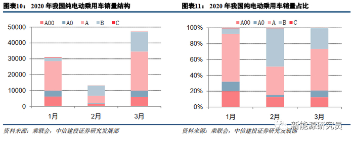 据乘联会统计,2020年3月新能源乘用车批发销量(含特斯拉)5.6万辆,同比下滑了49.2%,环比2月增长了4倍。纯电动乘用车批发销量4.7万辆,同比下降48%;其中插电式混合动力乘用车批发销量0.92万辆,同比下降59%。1-3月,新能源乘用车批发销量为11.5万辆,其中纯电动乘用车9.4万辆,插电式混合动力乘用车2.1万辆。1-3月销量同比2019年因高基数、疫情影响有一定程度下滑,和2018年水平相当。Model 3标准续航升级版的相对优势使得B级轿车占比从2019年的极少提升至2020年1-3月的约23%。