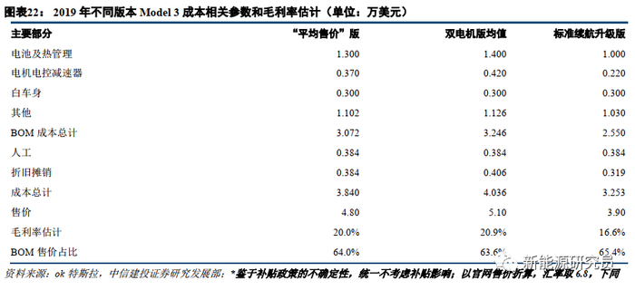 我们也进一步估计,Model 3不同类型车型后续还有相当降价空间;车型对搭载电池的选择也有进一步优化的余地。