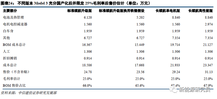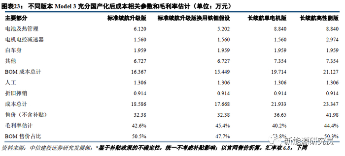 考虑美国和中国的增值税差异,再考虑国产标准续航升级版、单电机长续航版和高性能版在整车不同部分的降本能力差别(假定充分国产化后需进口者降本幅度5%,可自产高门槛者10%,可自产低门槛者15%,动力电池部分单独估计),Model 3国产各个版本的(电池技术路线不变,其他环节充分国产化)成本结构和毛利率就能够一并估出(假设条件为充分国产化降本后,故当前成本应高于估计值,毛利率应低于估计值;忽略长续航单电机版和长续航高性能版的轮毂区别;单位换用人民币万元;为公平起见,统一不考虑补贴造成的售价影响)。