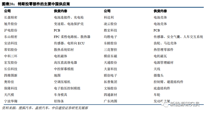 2020年,特斯拉有望实现其零部件国产化率从30%到近100%的转变。我国多家企业进入特斯拉供应链,零部件内容涵盖动力电池及电池管理系统、热管理系统、电机电控、白车身、底盘、中控系统等。另外,多家电池材料企业是松下、LG化学与宁德时代的供应商。