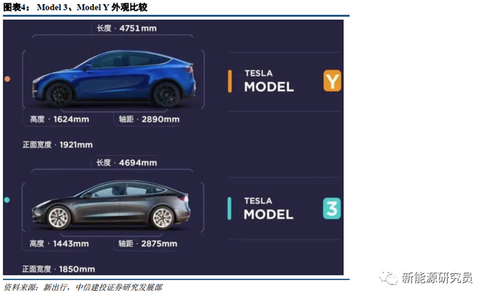Model Y定位B级SUV,暂有长续航双电机版、长续航高性能版两种车型。其长度、轴距略大于Model 3,高度、正面宽度显著大于Model 3,这使得Model Y 在头部空间、腿部空间、肩部空间以及前排臀部空间方面表现更优;带电量和Model 3对应车型相同。在尺寸增大、风阻增加的条件下其百公里电耗比Model 3稍高,工况续航有所缩减。