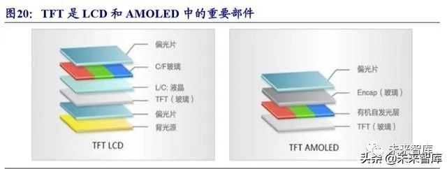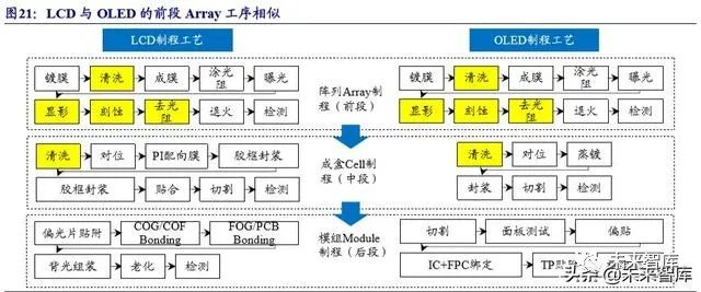 薄膜晶体管是LCD和AMOLED中的重要部件。面板显示行业中两大主流技术, TFT-LCD 和 AMOLED,其制造过程均可分为三大阶段:前段阵列工序(Array)、中 段成盒工序(Cell)以及后段模块组装工序(Module), 薄膜晶体管(TFT)在两大 显示技术中均发挥了重要的作用。TFT 在 LCD 中充当电路开关的作用,用来控制液 晶显示;AMOLED 全称主动矩阵有机发光二极体,TFT 就是这个“主动矩阵”,即 用晶体管控制的开关矩阵。一片表面平滑、没有任何杂质的玻璃基板,制成可用的 薄膜电晶体,需要重复清洗、镀膜、上光阻、曝光、显影、蚀刻、去光阻等过程, 即 Array 制程。相较于传统非晶硅(a-Si)TFT-LCD 的 Array 制程,OLED 采用低温 多晶硅(LTPS) TFT 作为基板,因此其具体工序及所用湿电子化学品种类有所差异。