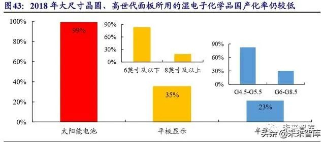 三大应用领域国产化率不一,高等级产品仍待突破。中国大陆湿电子化学品整体技 术水平与海外存在较大差距的原因,一方面大陆相关企业起步较晚,另一方面相比于欧 美日湿电子化学品产生于大规模集成电路时代、韩国湿电子化学品产生于液晶面板的爆 发,中国大陆湿电子化学品是跟随光伏产业发展起来的,因此 2010 年以前内资厂商的技 术水平整体停留在 G1、G2 等级。自 2011 年起我国多家湿电子化学品企业在设备装备上 开始进行大规模投资,工艺技术档次也有迅速的提升,能够逐步满足下游显示面板、集 成电路日益增长的需求。根据中国电子材料行业协会的统计数据,2018 年太阳能电池、 平板显示、半导体领域的湿电子化学品国产化率分别约为 99%、35%、23%(按销售供 应量计) ,太阳能电池市场基本满足生产需求,而平板显示、半导体领域的国产化率反而 较前两年小幅下降,主要原因是高世代面板线和大尺寸晶圆加工对高等级湿电子化学品 的需求增加。具体来看,2018 年我国晶圆加工所用的湿电子化学品,在 6 英寸及 6 英寸 (一般为 0.8-1.2μm、0.5-0.6μm)以下的国产化率为 83%左右,在 8 英寸及 8 英寸以上(含 0.25-0.35μm、28nm-0.18μm)的国产化率不足 20%,大部分产品来自进口;2018 年我国 平板显示所用的湿电子化学品,在 G4.5 至 G5.5 代线的国产化率超过 80%,而在 G6 至 G8.5 代线的国产化率仅为 29%,OLED 面板所需的湿电子化学品目前仍有品种被韩国、 日本和我国台湾地区的少数电子化学品厂商垄断。由此可见,如果未来能够在高端领域 实现进口替代的突破与进展,我国内资湿电子化学品企业发展空间广阔。